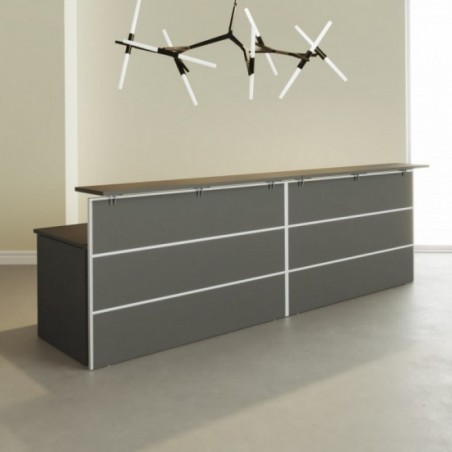 - L’assemblage entre le plateau d’accueil et la structure du meuble est effectué au moyen d’une pince métallique avec finition peinture époxy ARGENT RAL-9006.